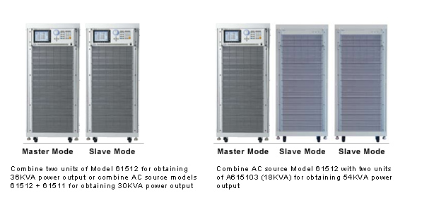 61511/61512/61611/61612交流供应器可经由(Master-Slave)并联输出模式以达成使用者对于高功率的需求。例如:连接5台18KVA交流供应器在并联模式下可实现90KVA的输出功率。使用者还可利用专为并联模式所开发的18KVA并联专用机为有效替代slave单机的解决方案。请参考以下为61511/61512/61611/61612及A615103在并联模式下的配置图。