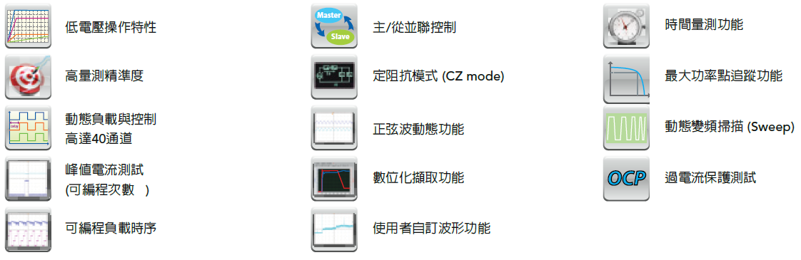在快速的时代里,电子组件皆朝高速运作的方向设计,因此,电源组件对于瞬时的信号及动态响应的性能要求,比过去都高出许多。为满足这些测试应用与要求,63600系列提供高速、可编程动态负载、动态变频扫描sweep模式等。