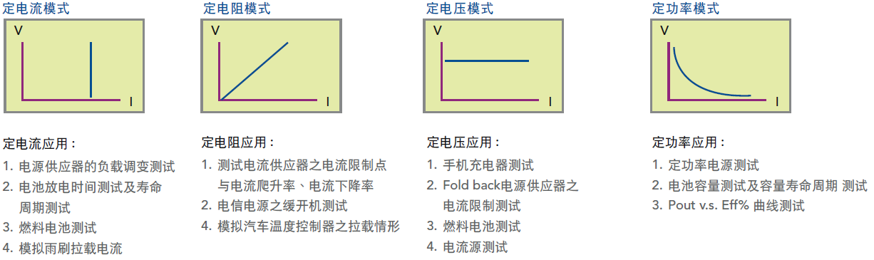 63600系列有定电压、定电流、定电阻、定功率与定阻抗模式,藉由这些操作模式可以来满足广泛的测试需求。举例来说,定电压模式可以应用于电池充电器的充电测试。