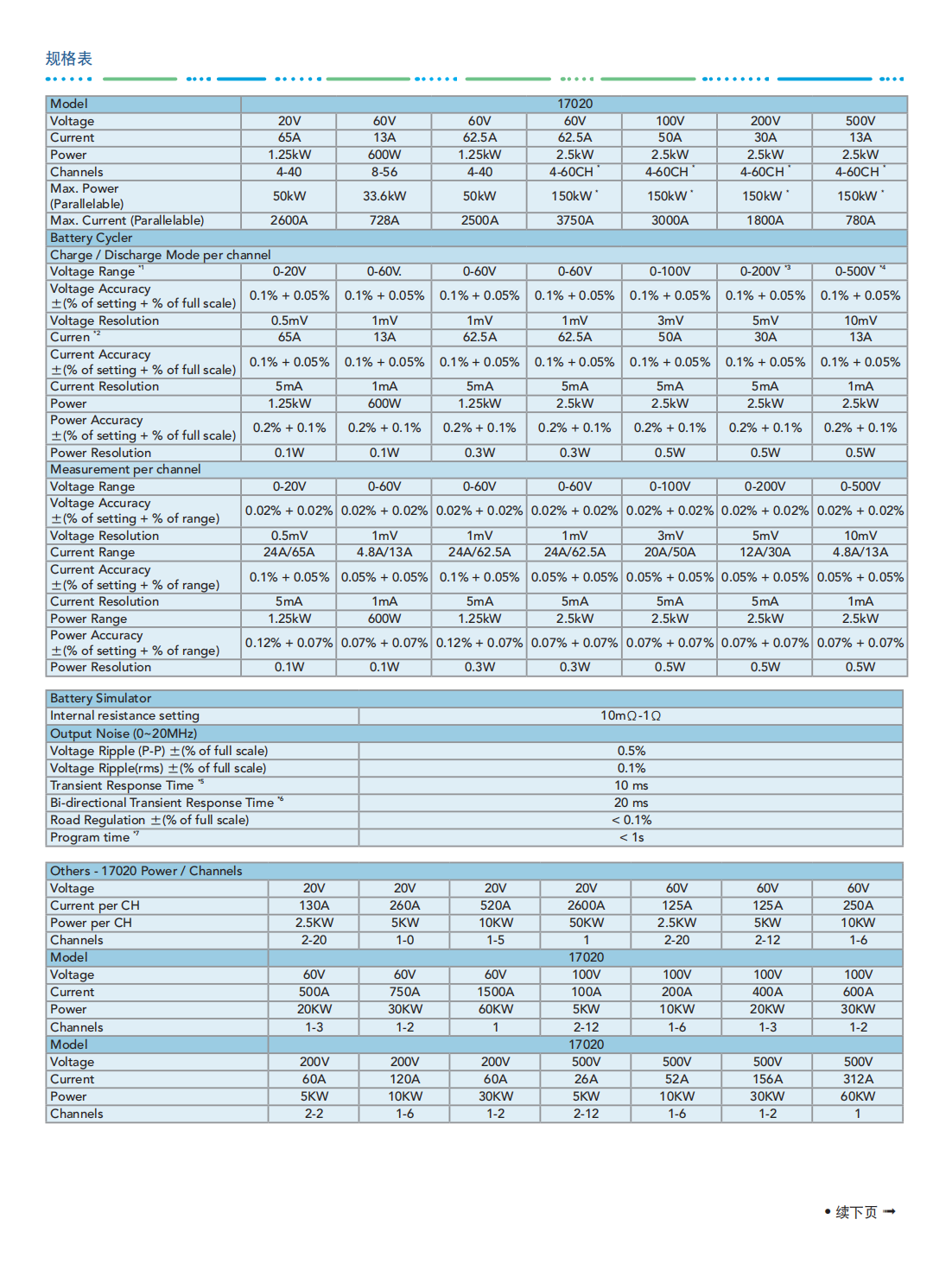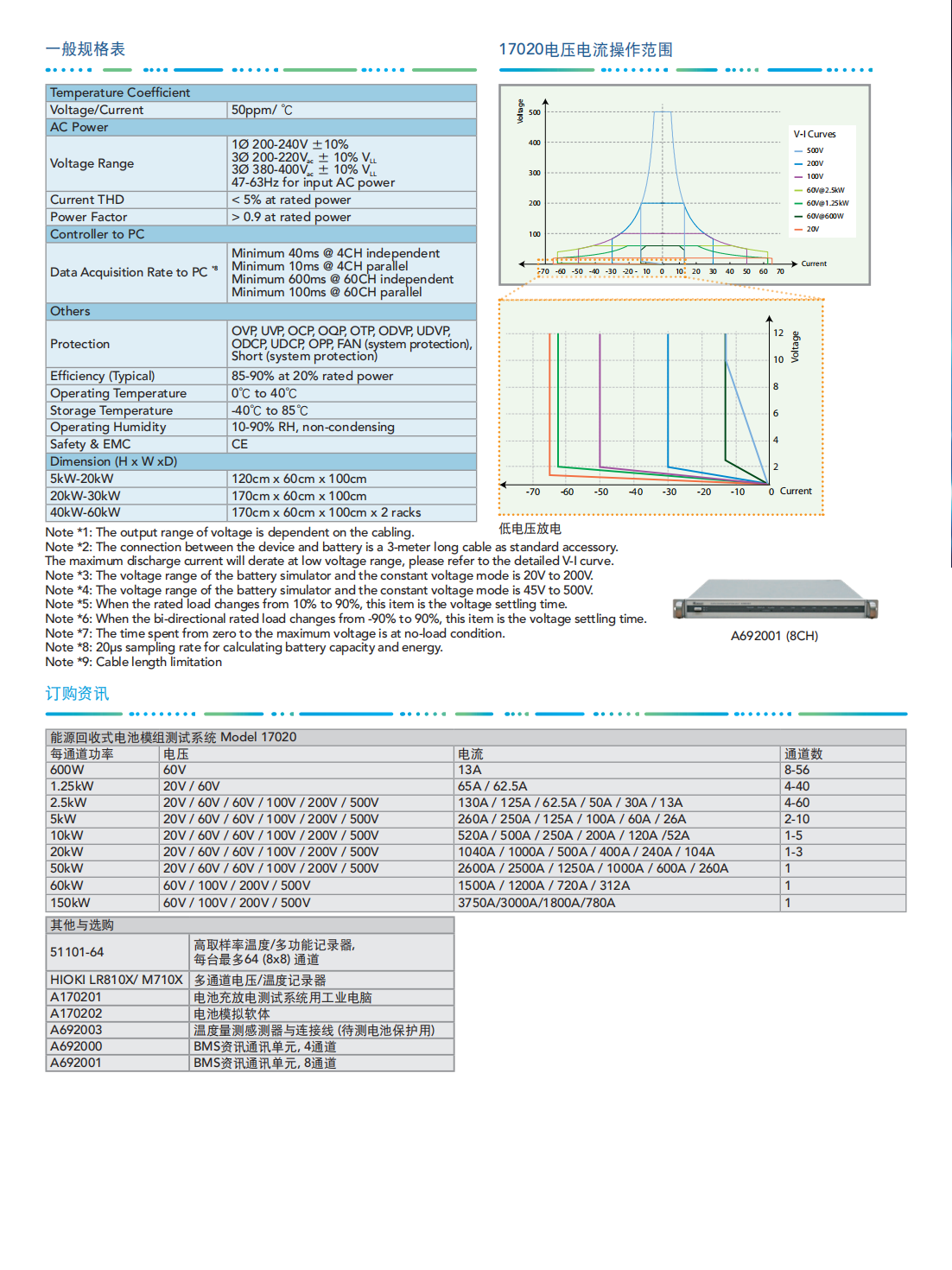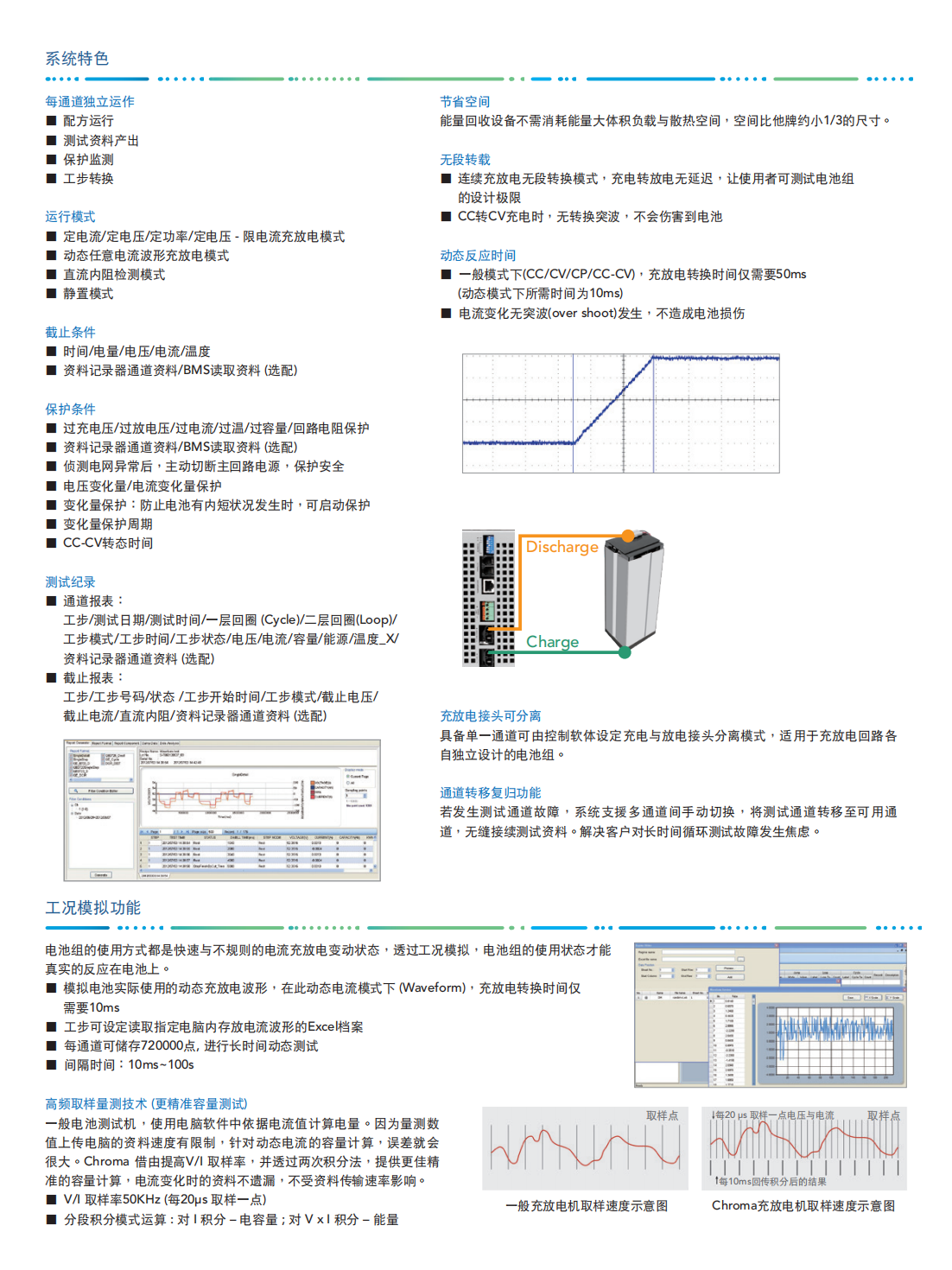 Chroma 17020系统是专门为二次电池组测试而开发的高精密设备,适合用于电池组续航力试验、产品进出货检验、设计验证研究、电池组生产线上容量学习(Learning)与测试等用途。