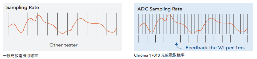 Chroma 17010透过高速的电压及电流采样搭配双重积分法计算,不失真地准确撷取测试中的瞬态变化,提供更高精确度电容量计算,解决一般电池充放电设备仅使用报表采样速度纪录关键数据而造成较大累计误差。