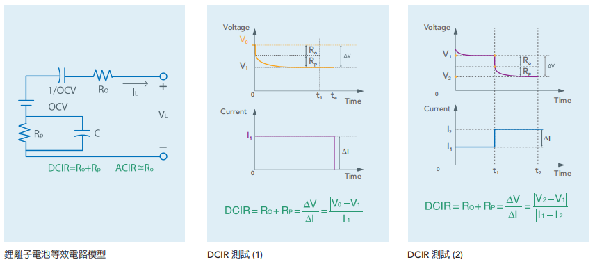 电池内阻值关系着电池可应用充/放电倍率,内阻越大效率越差且易发热温升而老化加速。传统LCR Meter 1KHz的交流内阻(ACIR)测量方法,只能评价出影响瞬间功率输出的欧姆电阻(Ro),但无法评价电化学反应时所产生的极化电阻(Rp);直流内阻(DCIR)的评价即包含ACIR的阻值,其测试方式更贴近于车用电池连续电流应用的实际极化效应。