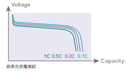 常用来评价电池在不同倍率的电流进行充放电测试时,电压平台的维持程度与电容量测试结果,常见于材料开发过程中的活性物质比例调整与动力电池对于快速充放电的表现验证上。