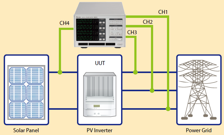 66203/66204的量测通道可分别进行独立量测,因此适合应用于待测物的多点量测。例如:可以使用66204的4通道分别量测太阳能逆变器的输入及三相输出交流参数值部份。另外,66203/66204也支援功率效能计算功能。使用者可以应用此功能计算出待测物的整体效能,针对太阳能逆变器输入端1000Vdc高压量测部份可搭配HV功能及选配治具使用。