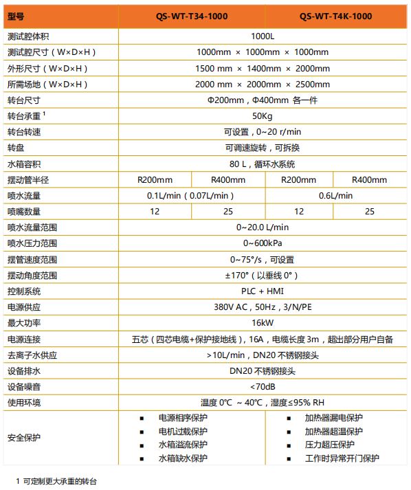 水泵s带轴向吸气口和径向排气口的紧凑型高可靠卧式多级端吸离心泵,用于给水路系统提供充足的水流量;与液体接触的泵体材料为不锈钢,水泵上安装了一台 3 相位带冷却扇的异步电动机;水泵体积小、噪音轻、性能可靠⚫Danfoss电动智能控制阀,用于控制水路流量,以满足测试标准要求;控制阀由调节阀和泄压控制阀组成,控制信号自动断线监测、自由自检定位、防振荡、过热和过载保护等功能,保证控制的稳定和准确流量传感器 压力传感器 伺服电机 SINAMICS V90 控制器 SIMATIC S7-1200ID设备主要信号与报警触发显示,如电源相序、电机故障、箱门信号等水箱温度、管路压力、管路流量和转台转速曲线显示水箱温度、管路压力、管路流量和转台转速数字显示每个角度喷嘴运行与计时显示测试进度显示设备运行信息提示保护型运行与停止触摸按键,每个操作均需确认① 每个喷嘴的喷射时间可单独设置,喷射时间为0的喷嘴不工作② 可设置相邻两个喷嘴之间的间隔时间,间隔时间为0表示连续喷射③ 可设置每个测试循环的间隔时间,间隔为0表示连续运行④ 转台速度设置可达20r/min⑤ 水箱温度设置最大值为85℃⑥ 每次参数的修改需保存后方可生效